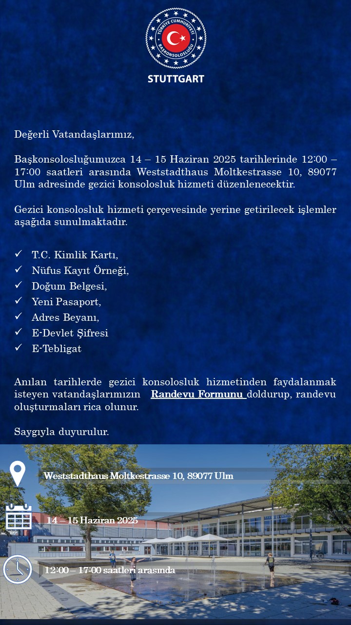 Başkonsolosluğumuzca 14 – 15 Haziran 2025 tarihlerinde 12:00 – 17:00 saatleri arasında Weststadthaus Moltkestrasse 10, 89077 Ulm adresinde gezici konsolosluk hizmeti düzenlenecektir.